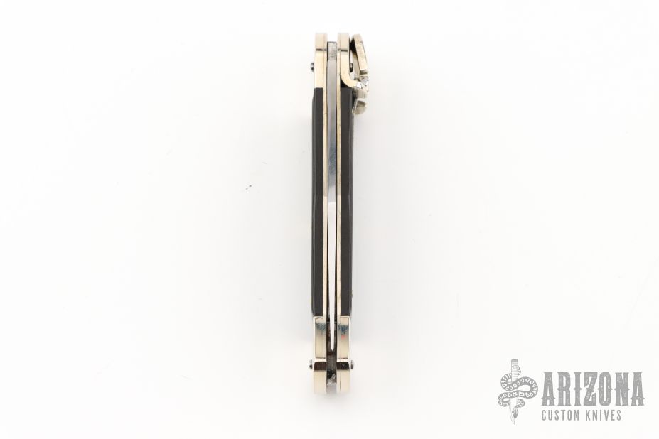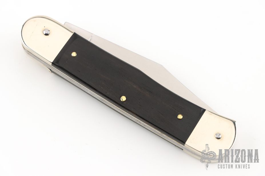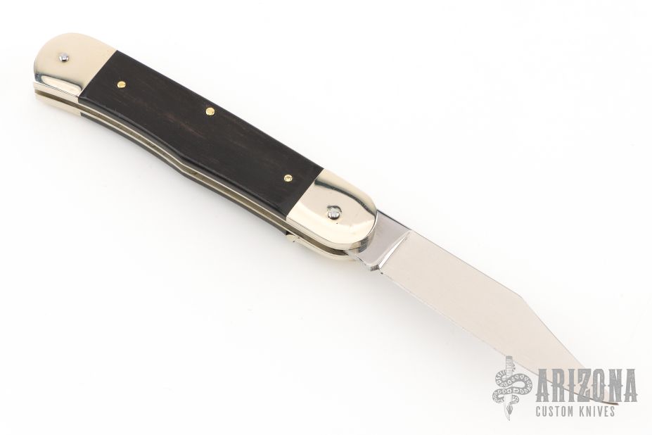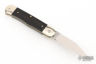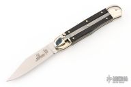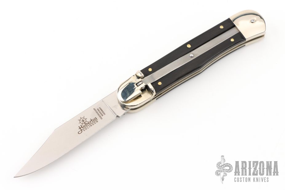 This leverlock auto by Hubertus features a tumble polished blade. The handle has nickel silver double bolsters, ebony scales, nickel silver liners and brass pins. Comes with original box and papers. New condition.