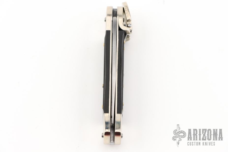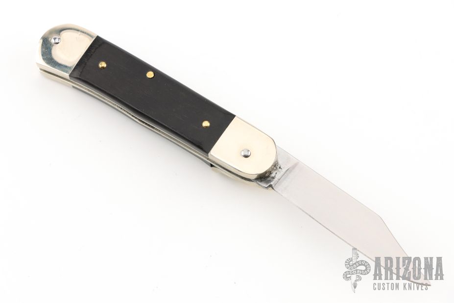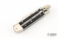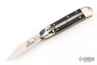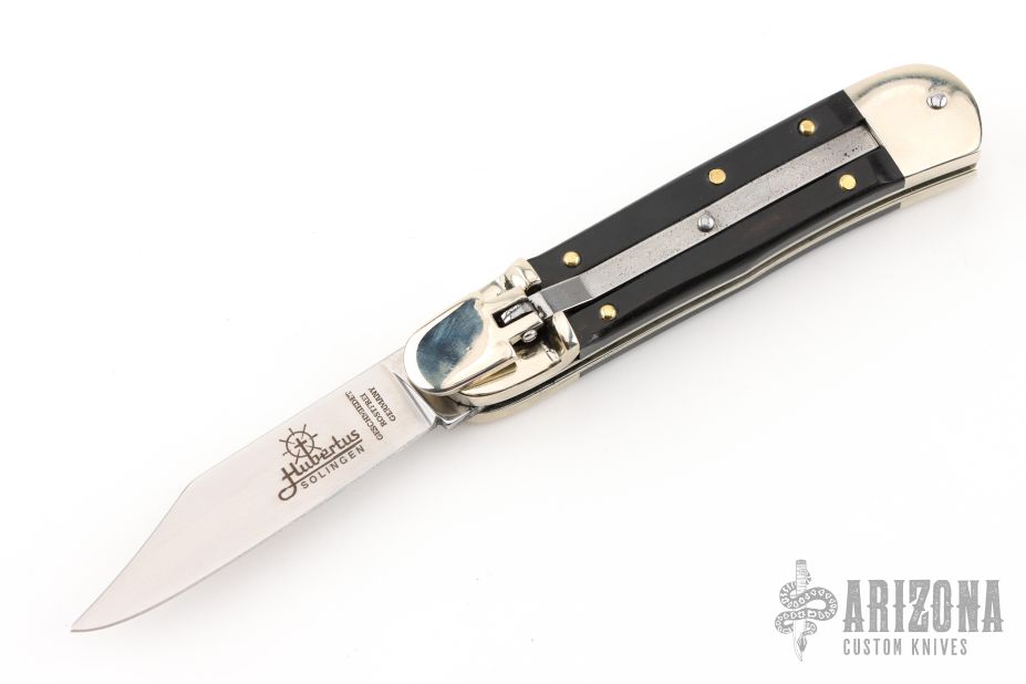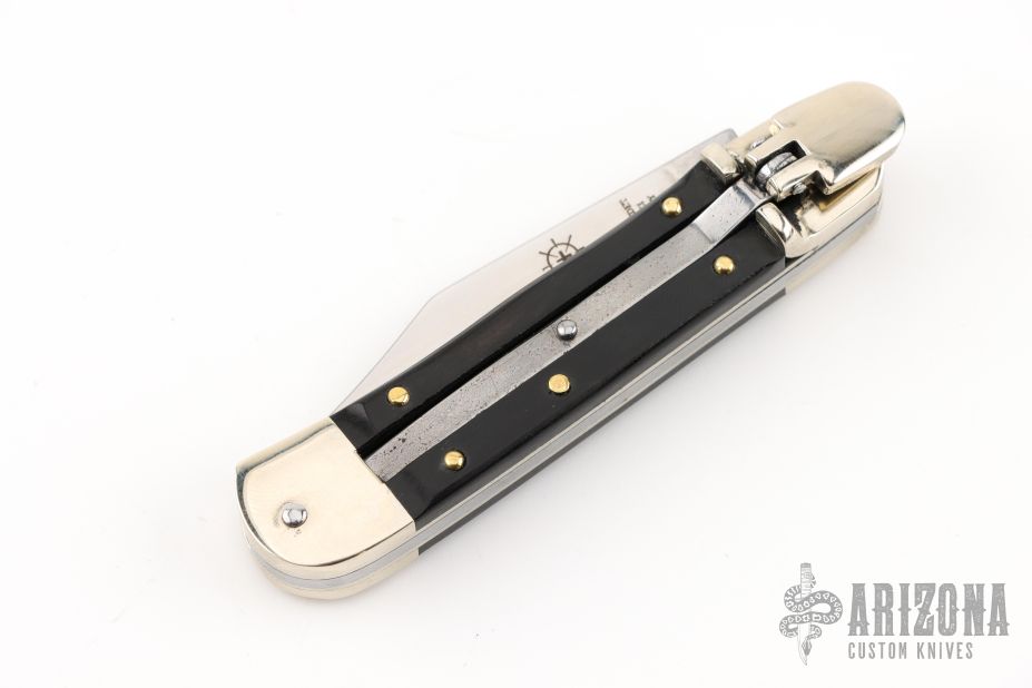 This leverlock auto by Hubertus features a tumble polished blade. The handle has nickel silver double bolsters, ebony scales, nickel silver liners and brass pins. Comes with original box and papers. New condition.