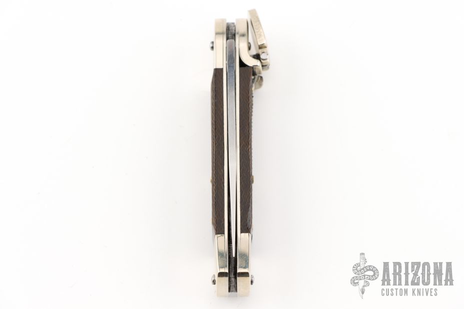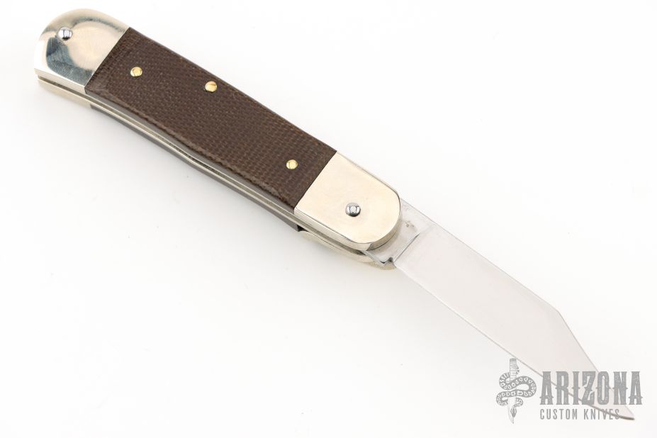 This leverlock auto by Hubertus features a tumble polished blade. The handle has nickel silver double bolsters, canvas micarta scales, nickel silver liners and brass pins. Comes with original box and papers. New condition.