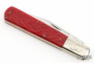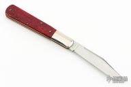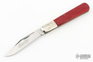 This slipjoint by Robeson Cutlery features a polished blade with nail nick. The handle features nickel silver bolsters and jigged red bone covers over brass liners and stainless steel spring. Includes original box. Excellent Condition.