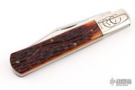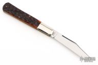 This slipjoint by Robeson Cutlery features a polished blade with nail nick. The handle features nickel silver bolsters and jigged brown bone covers over brass liners and stainless steel spring. Includes original box. Excellent Condition.