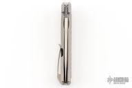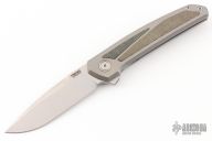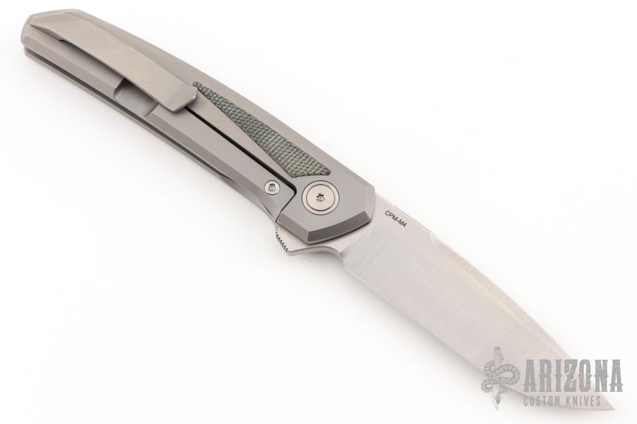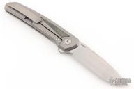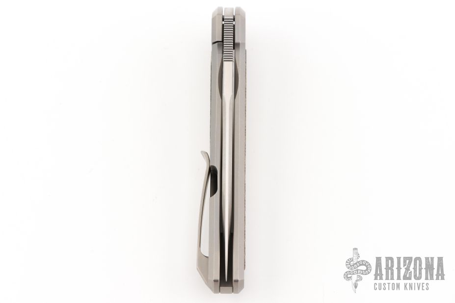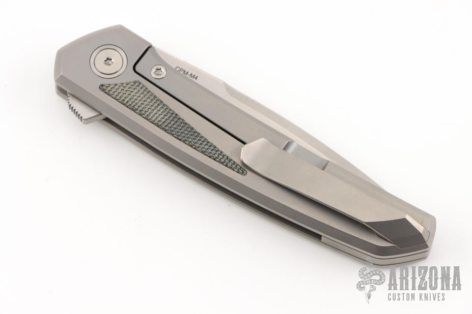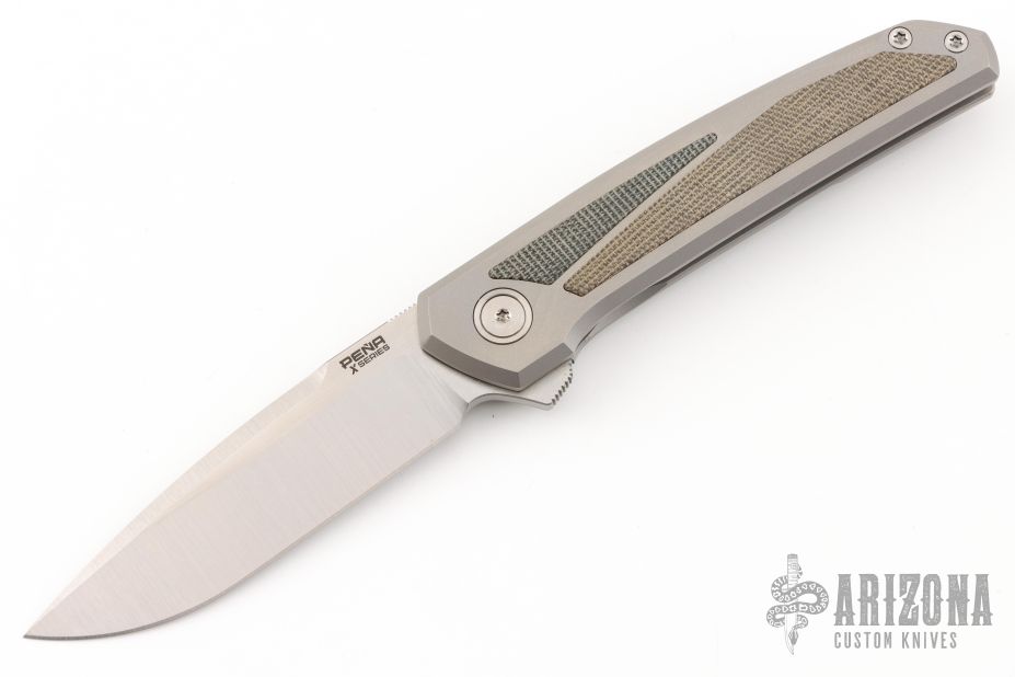 This Cobra framelock by Enrique Pena features a satin finished drop point blade with swedge, notched thumbrest and dual thumbstuds. The handle has a bead blasted titanium frame with green/black canvas micarta inlays, a titanium backspacer with lanyard pin. Matching tip up titanium clip.  Includes the original box and papers. New from maker!