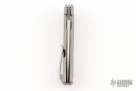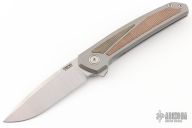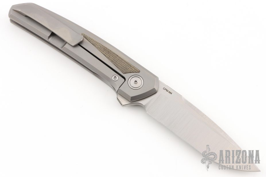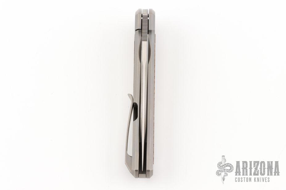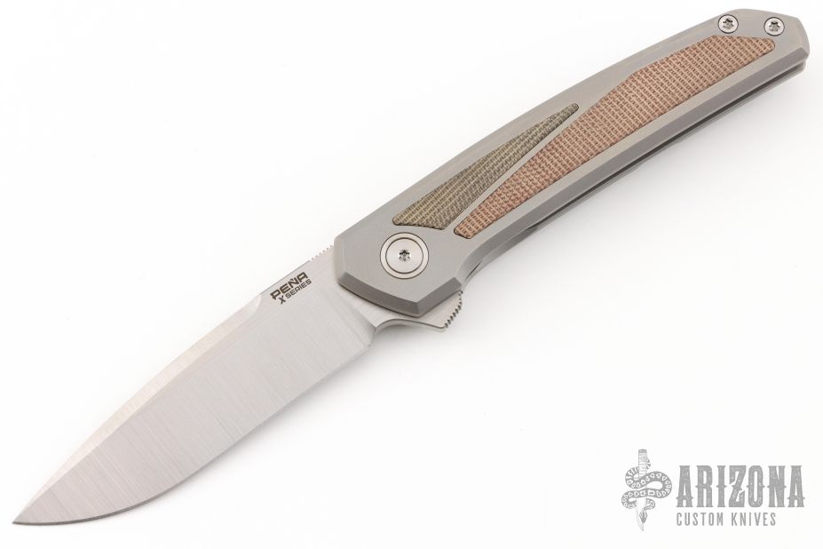This Cobra framelock by Enrique Pena features a satin finished drop point blade with swedge, notched thumbrest and dual thumbstuds. The handle has a bead blasted titanium frame with green/brown canvas micarta inlays, a titanium backspacer with lanyard pin. Matching tip up titanium clip.  Includes the original box and papers. New from maker!