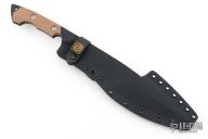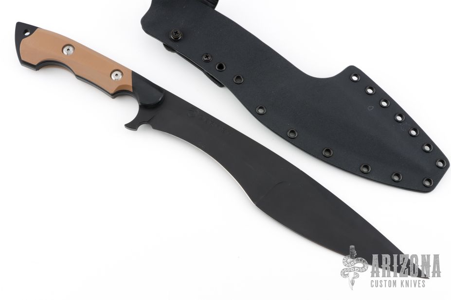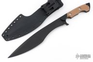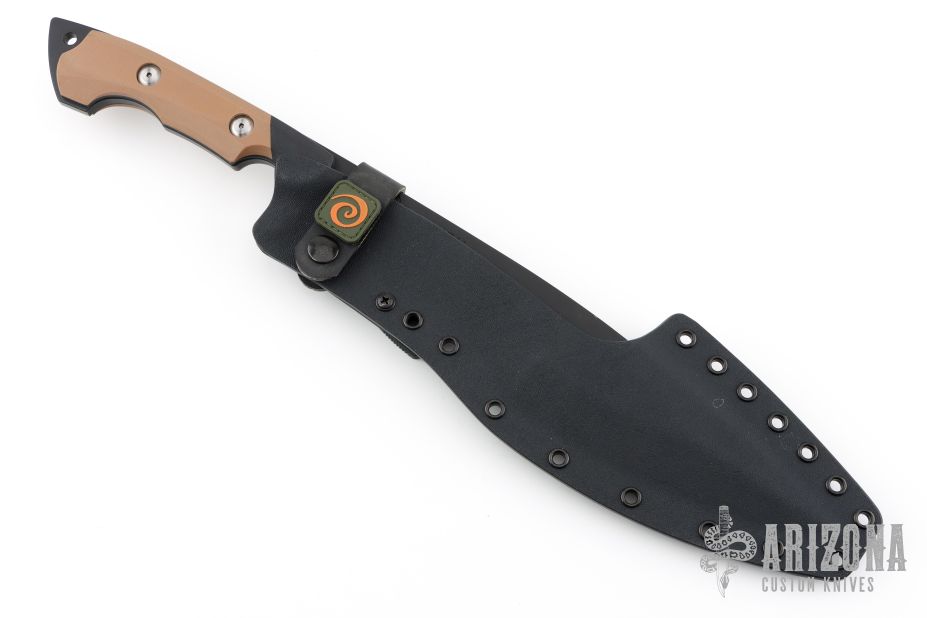This Ursa Major MT from Dervish Knives features a spear point recurve blade with Cerakote finish, .252" blade stock and 2.152" blade depth, full tang construction. The handle has black G-10 bolsters/liners, brown G-10 scales, and an extended tang with skull crusher and lanyard hole. Comes with a kydex sheath with TekLok. Has a few scuffs on the blade and handle, otherwise excellent condition.