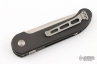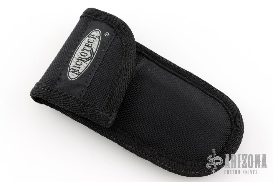 This UMS side opening coil spring automatic by Microtech features a stonewashed blade and black aluminum handle with non-slip inlays and a tip up stainless steel clip. Sliding safety. Dated 03/2003 and #0032. Includes original sheath. Has a couple very light scuffs, otherwise excellent condition.