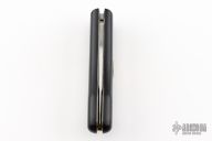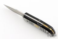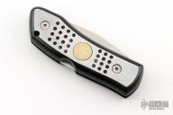 This auto by MCM Maniago Italy features a satin finished blade. The handle has a two-tone aluminum frame with brass push button. Has scuffs, otherwise excellent condition.