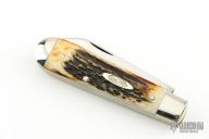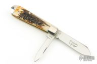 This slipjoint by Robeson Cutlery features two polished blades with nail nicks. The handle features nickel silver bolsters and stag covers over brass liners and stainless steel spring. Includes original box. Excellent Condition.
