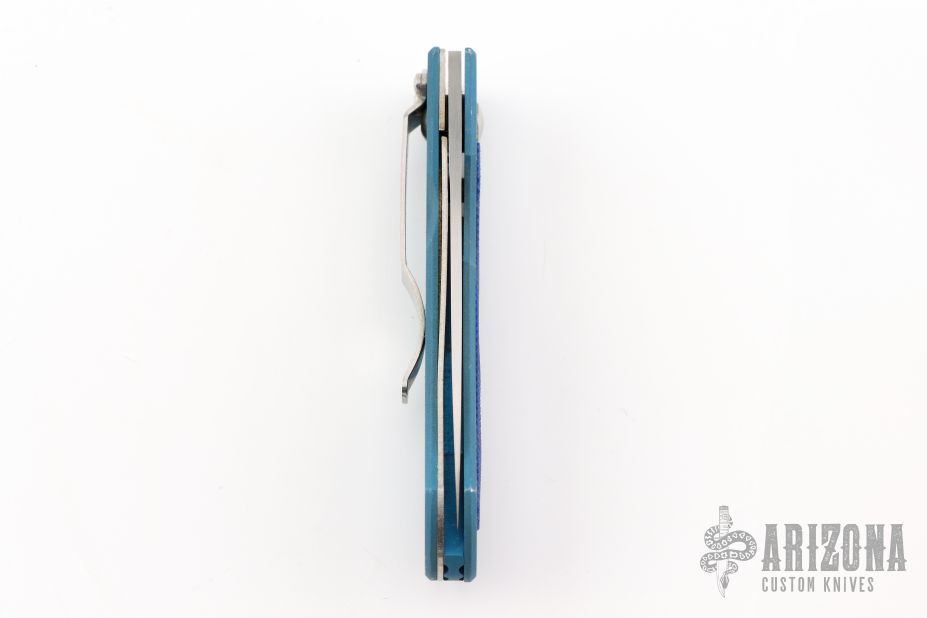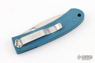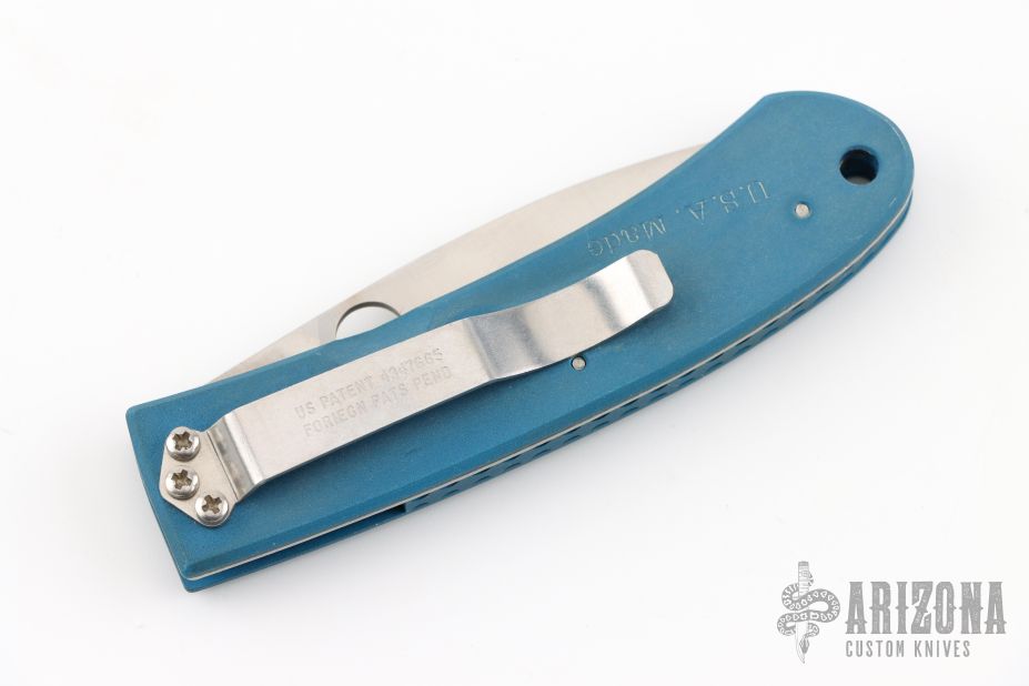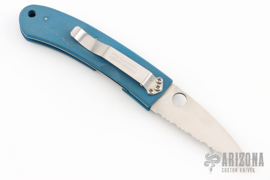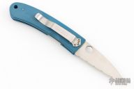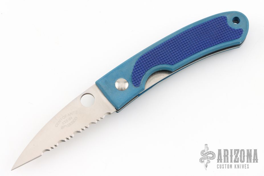 The C25SBL Centofante design from Spyderco has a serrated satin finish blade with thumbhole. The handle is blue aluminum with blue rubber inserts. Has a tip down stainless steel clip. Comes with original box. Has a couple very light scuffs, otherwise excellent condition.