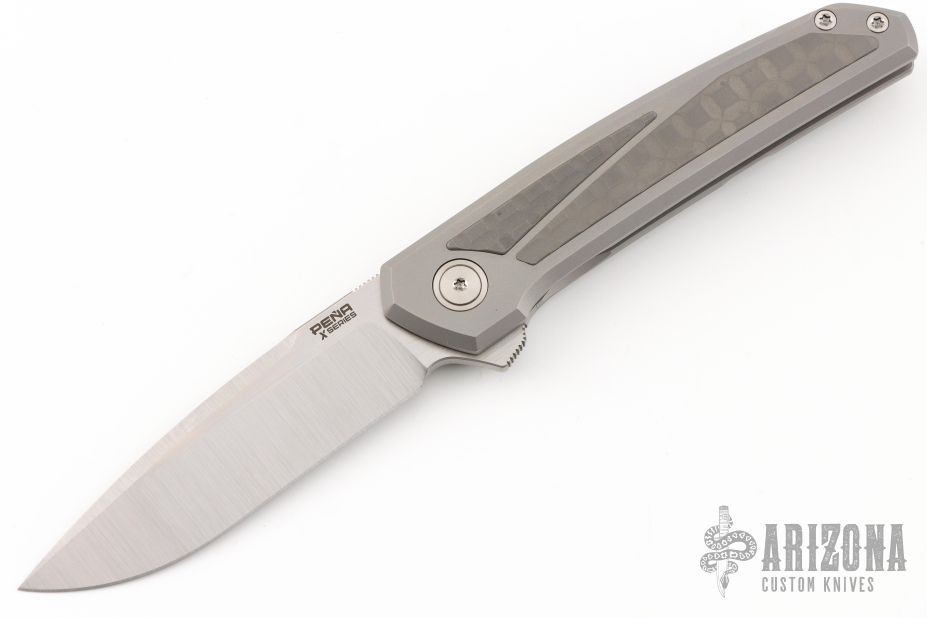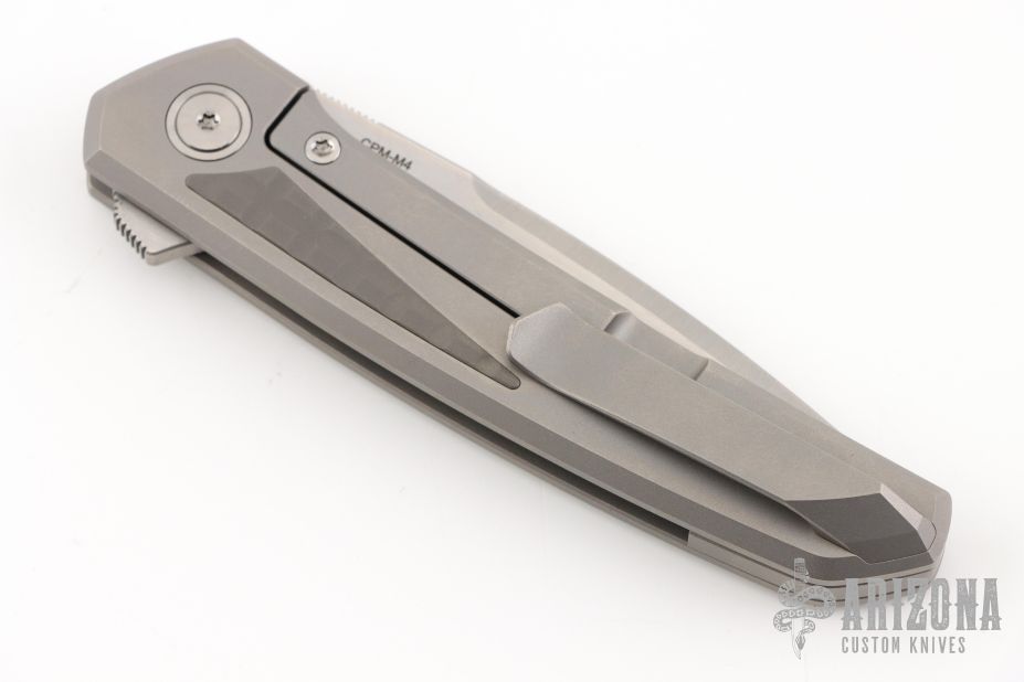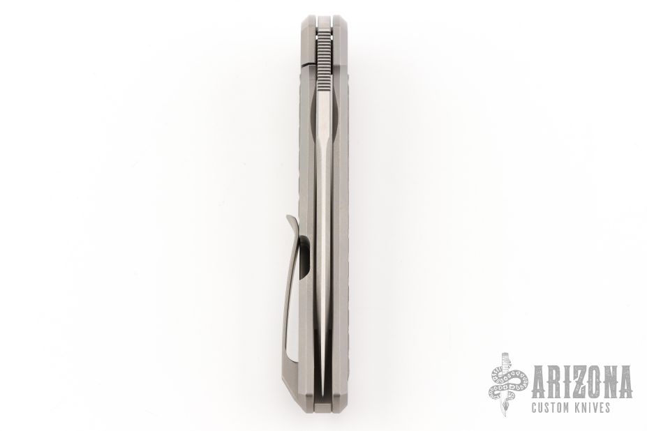This Cobra framelock by Enrique Pena features a satin finished drop point blade with swedge, notched thumbrest and dual thumbstuds. The handle has a bead blasted titanium frame with titaniun inlays, a titanium backspacer with lanyard pin. Matching tip up titanium clip.  Includes the original box and papers. New from maker!