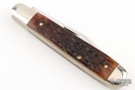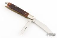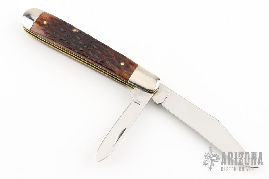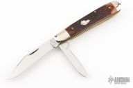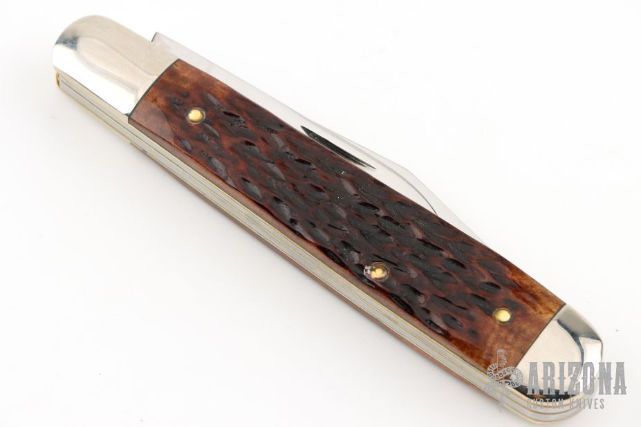 This Trapper from Ka-Bar features polished blades with nail nicks. The handle has nickel silver bolsters and pommel with jigged bone scales over nickel silver liners and steel springs. Comes with original box. Excellent condition.