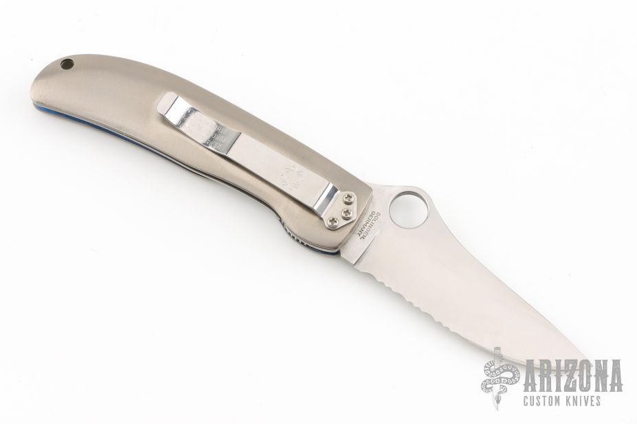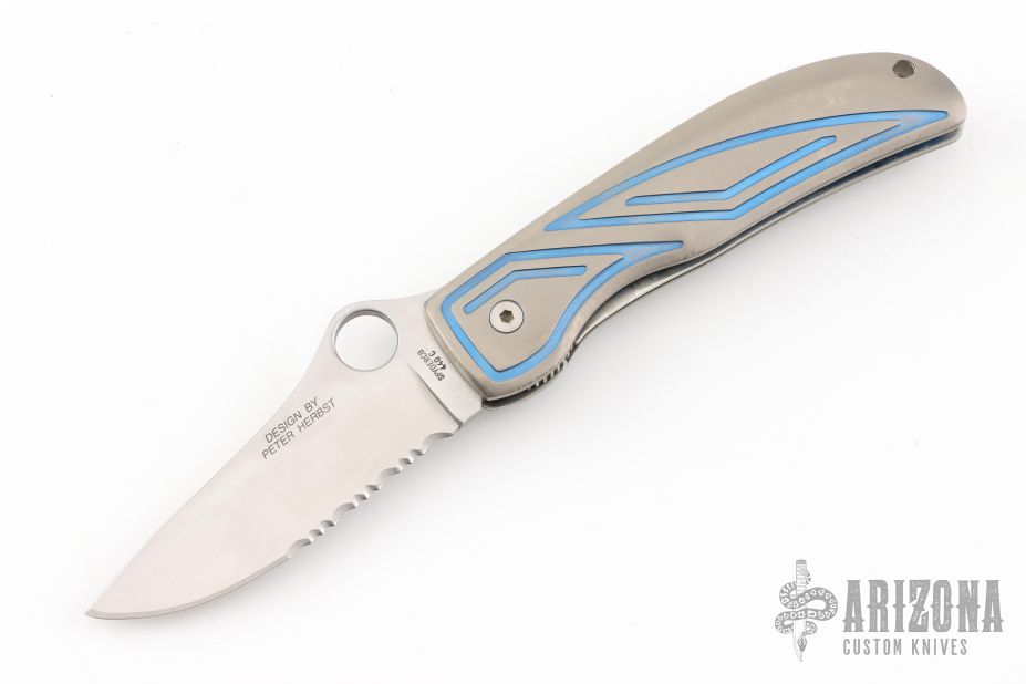 This is an extremely rare and hard to find original C53P! Design by Peter Herbst with a partially serrated satin finished blade and titanium handle with a tip down stainless steel clip.  Production was very limited (we've heard roughly 300) Comes with a Spyderco box. Has a couple light scuffs, otherwise excellent condition.