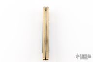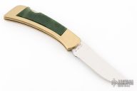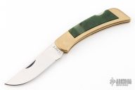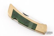 This Folding Sportsman by Gerber features a mirror polished upswept blade with nail nick. The handle has a brass frame with jade inlays. Has a few light scratches, otherwise excellent condition. Comes with original wooden display case.