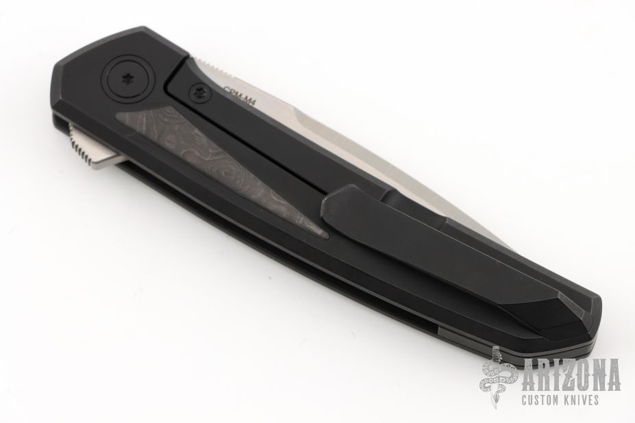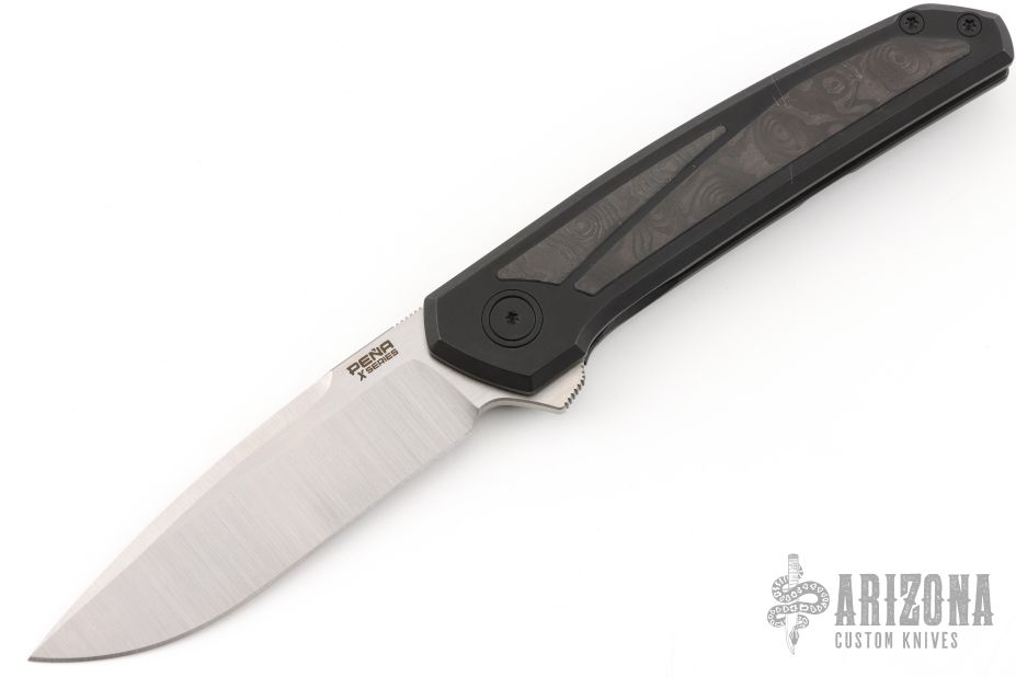 This Cobra framelock by Enrique Pena features a satin finished drop point blade with swedge, notched thumbrest and dual thumbstuds. The handle has a black titanium frame with black dunes carbon fiber inlays and a titanium backspacer with lanyard pin. Matching tip up titanium clip.  Includes the original box and papers. New from maker!