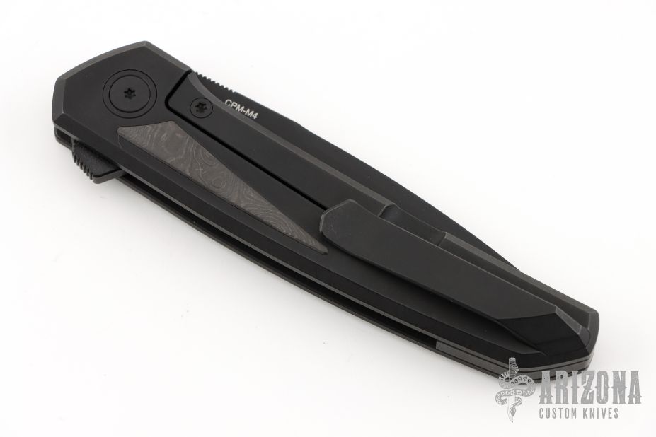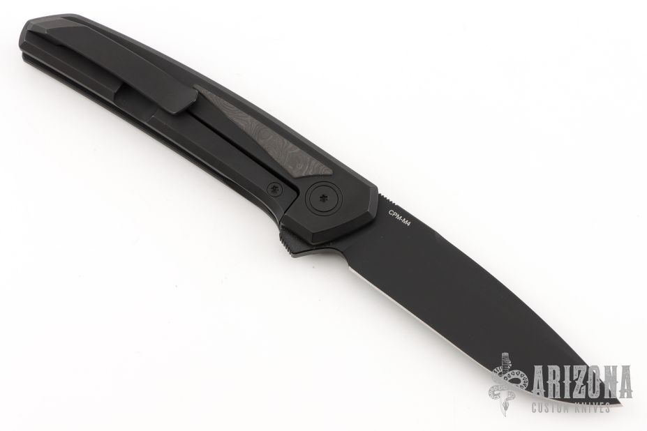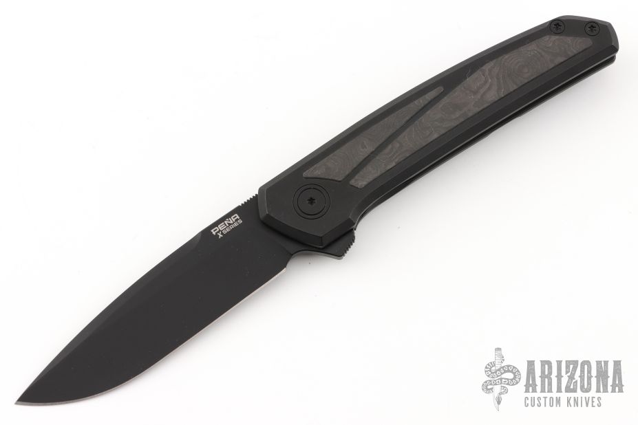 This Cobra framelock by Enrique Pena features a black drop point blade with swedge, notched thumbrest and dual thumbstuds. The handle has a black titanium frame with black dunes carbon fiber inlays and a titanium backspacer with lanyard pin. Matching tip up titanium clip.  Includes the original box and papers. New from maker!