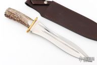 This TS-101 Trophy Stag Dagger by Frost Cutlery features a mirror polished double edged blade with fullers, .191" blade stock and 2.225" blade depth, hidden tang construction. The handle has a brass guard with stag grip. Comes with original box and leather sheath. Excellent condition.