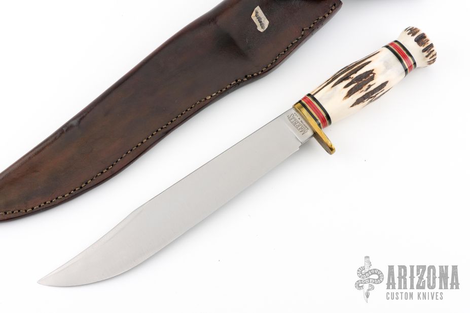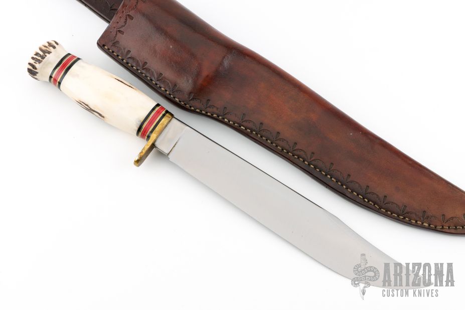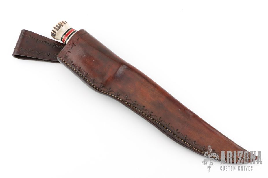This Trail Maker by Marbles features a clip point satin finished blade with a false top edge, .225" blade stock and 1.568" blade depth, hidden tang construction. The handle has a brass guard, stag butt, stag grip and black/brass/red/white spacer pattern. Comes with a hand tooled brown leather sheath. Has a couple light scratches, otherwise excellent condition.