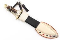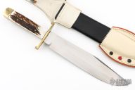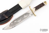 This Bowie by Hirschkrone features a satin finished blade with false top edge, .228" blade stock and 1.927" blade depth, full tang construction. Has an etched scene on the blade. The handle has a brass guard and rear bolsters, stag scales. Comes with a black and white leather sheath. Has some light scratches, otherwise excellent condition.