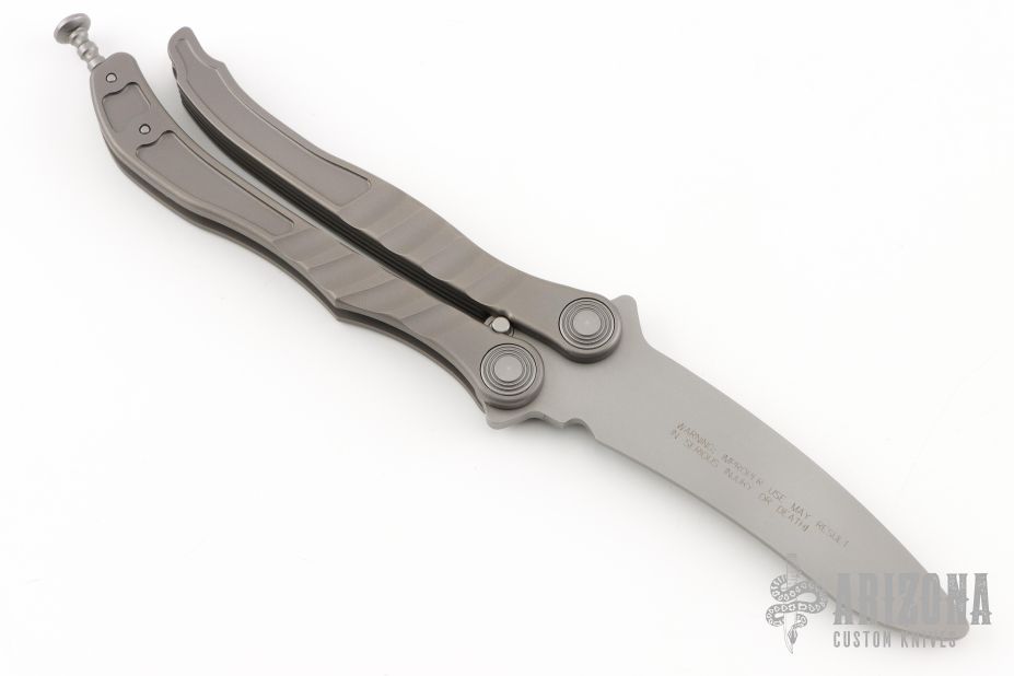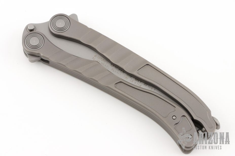This Metalmark Trainer from Microtech features a bead blast finished recurve chisel ground blade with swedge. The handle is comprised of bead blasted titanium with spring loaded latch on pommel. Comes with original box, sheath and papers. Dated 09/2012. Reads "FOR TRAINING PURPOSE ONLY" on the blade and "WARNING: INPROPER USE MAY RESULT IN SERIOUS INJURY OR DEATH!" Excellent condition.