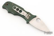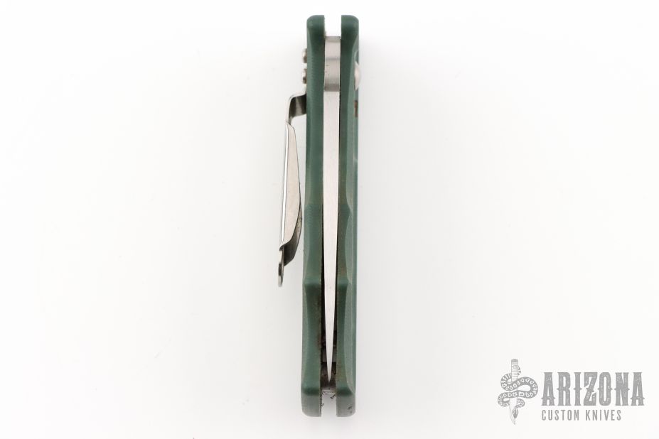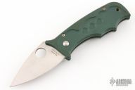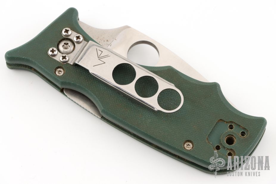 This Lil Temperance by Spyderco has a satin finished blade with thumbhole. The handle has green G-10 scales, stainless liners and tip up or down reversible clip. Comes with original box. Has some light scratches, and a little blade play, otherwise good condition.