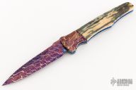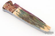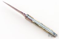 This Custom Merc Scale Release Automatic by Rainy Vallotton features a blued Damascus spear point blade with false top edge. The handle has fluted blued Damascus bolsters, mammoth ivory scales, anodized and fileworked titanium liners with jeweled interiors, fileworked stainless steel backspacer. Nice action and lockup. Includes a velcro Bill's Custom case. Has a couple very light scratches, otherwise excellent condition.
