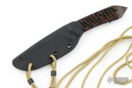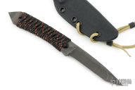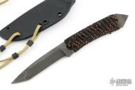 This knife by Kim Breed features a black tanto blade with .190" blade stock and .780" blade depth, full tang construction with cord wrap. Comes with a kydex sheath. Has some scuffs on the finish, otherwise excellent condition.
