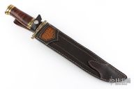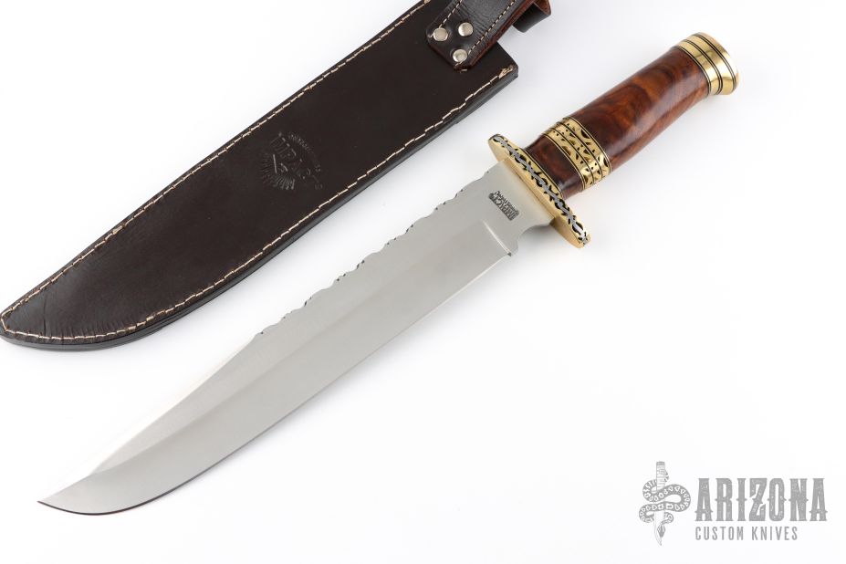 This Bowie by Impact Custom Knives features a satin finished blade with false top edge and fileworked spine, .187" blade stock and 1.978" blade depth, hidden tang construction. The handle has a fileworked brass and Damascus guard, dark wood grip with black and fileworked brass spacers, brass and black butt. Comes with a brown leather sheath and COA dated April 23, 2017. Has some light scratches, otherwise excellent condition.