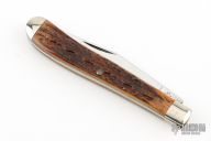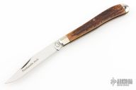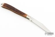 This slipjoint by queen cutlery co features a mirror finished blade with nail nick.  The handle features nickel silver bolsters, brass liners and jigged bone covers. Steel spring. Comes with original box. Has light scratches, otherwise excellent condition. #070 on the bolsters.