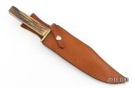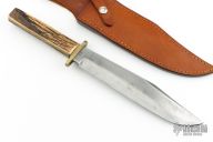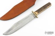 This Original Bowie Knife by PIC was imported from Solingen Germany, it features a satin finished clip point blade with false top edge, .277" blade stock and 1.883" blade depth, full tang construction. The handle has a brass guard and stag scales. Comes with original brown leather sheath. Has some scratches and patina, otherwise good condition for its age.