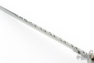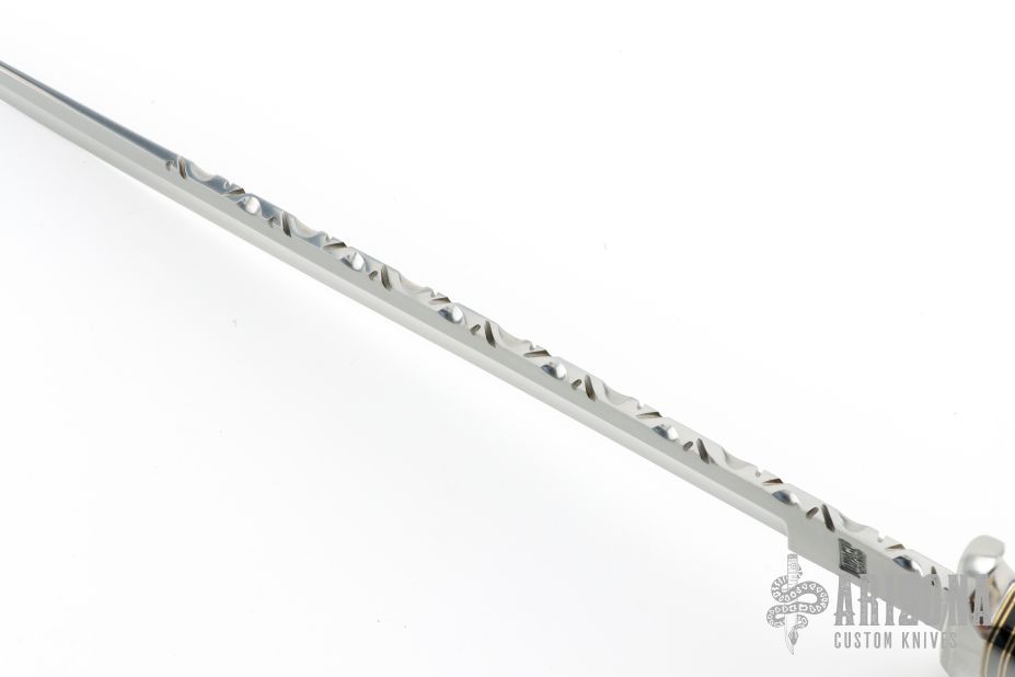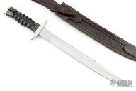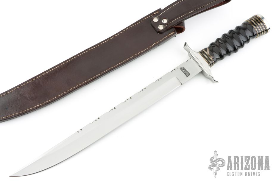 This Fighter by Impact Custom Knives features a satin finished blade with false top edge and fileworked spine, .187" blade stock and 1.214" blade depth, hidden tang construction. The handle has a steel guard and butt, grooved buffalo horn grip, brass and black spacers. Comes with a brown leather sheath. Has some light scratches, otherwise excellent condition.