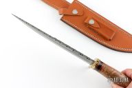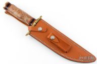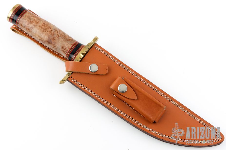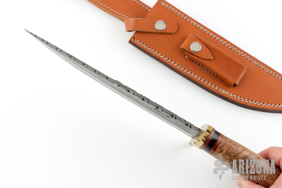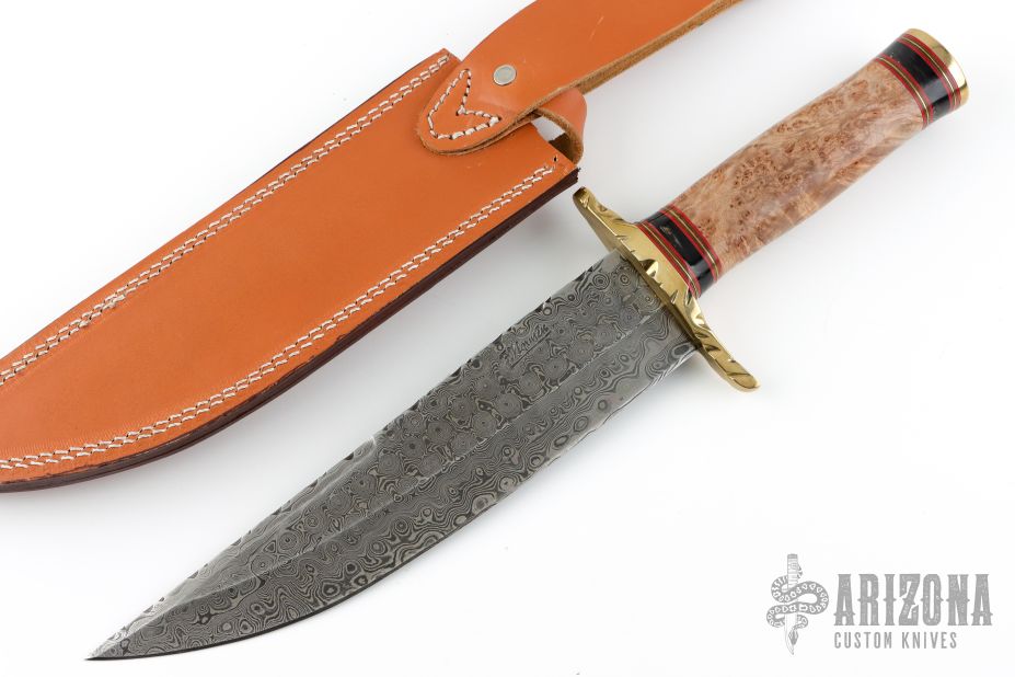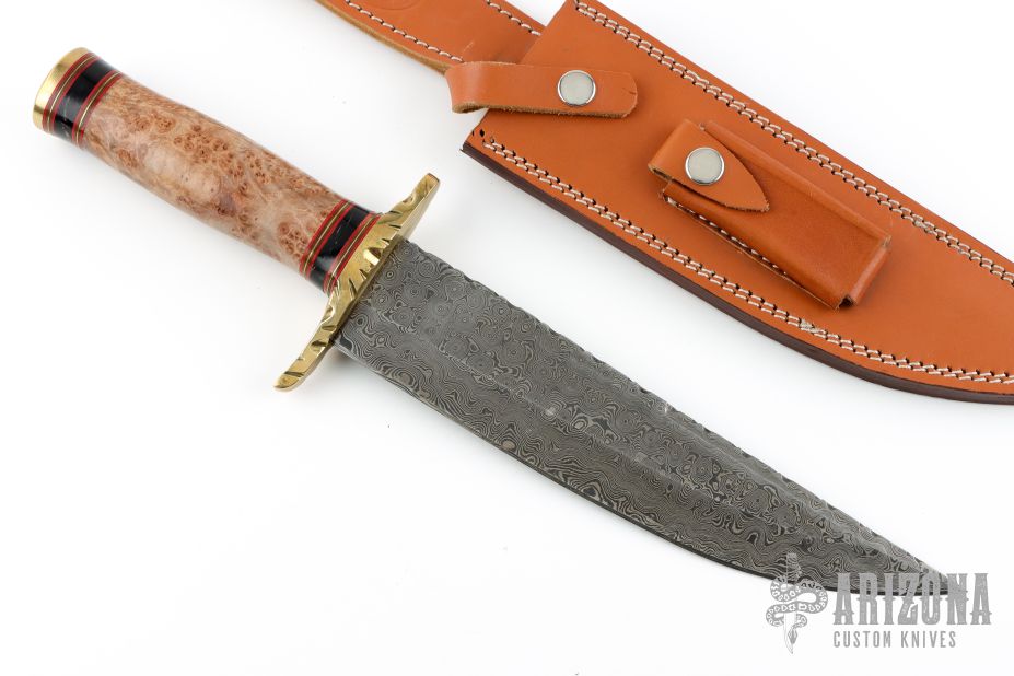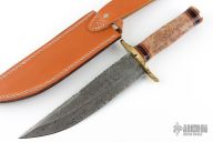 This Bowie by F Normen features a Damascus blade with false top edge and fileworked spine, .214" blade stock and 1.980" blade depth, hidden tang construction. The handle has a fileworked brass guard, bird's eye maple burl grip, red/green/brass/buffalo horn spacers, brass butt. Comes with a brown leather sheath. Excellent condition.