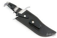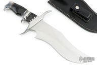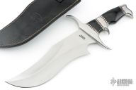 This Large Sub-Hilt Fighter by Impact Custom Knives features a satin finished blade with false top edge, .236" blade stock and 3.240" blade depth, hidden tang construction. The handle has a steel guard, sub-hilt and butt, black canvas micarta grip, red and fileworked steel spacers. Comes with a brown leather sheath and a zippered case. Has some light scratches and patina on the blade, otherwise excellent condition.