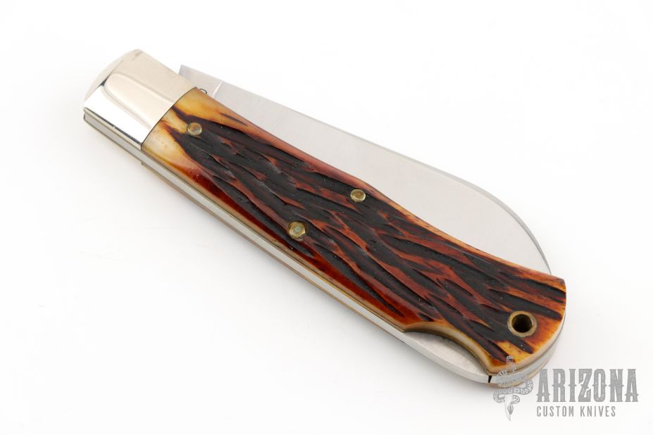 This Lockback by Great Eastern Cutlery features a polished blade with nail nick. The handle features nickel silver bolsters and jigged bone covers over brass liners and stainless steel spring. Includes original packaging. Excellent Condition. 25 made.