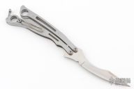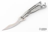 The Szabofly by Spyderco is no longer in production, if features a satin finish blade with swedge. The handle has bead blasted stainless steel handles with a spring loaded latch and a tip up reversible clip. Comes with original box and papers. Has a couple light scuffs, otherwise excellent condition.   #051