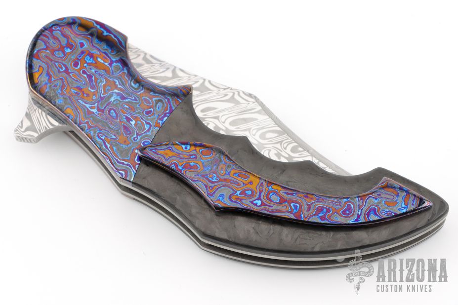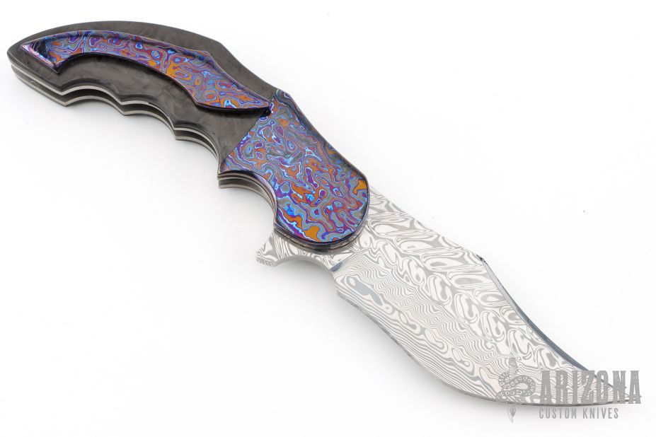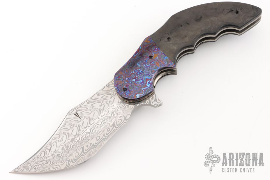 "Each blade is handmade by me in the USA using manual machines. I specialize in hard use tactical folders with the best materials I can get my hands on. My current blade steels are RWL-34, stainless steel Damascus, and San Mai. I use various materials that include Titanium, Carbon Fiber, Zirconium, MokuTi, Timascus."