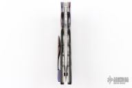 This Double Homicide framelock flipper by Jeff VanderMuelen features a Damasteel blade with flipper. The handle has ZircuTi bolsters, marble carbon fiber scales, stonewashed titanium liners, zirconium standoffs, zircuti clip with hidden screws, tip up carry. Rides on bearings, nice detent, lockup and blade seating. Comes with a zippered case. Inside of frame is dated 8/2019, signed and marked #104. Excellent condition.