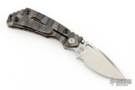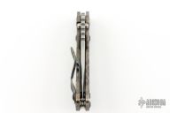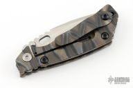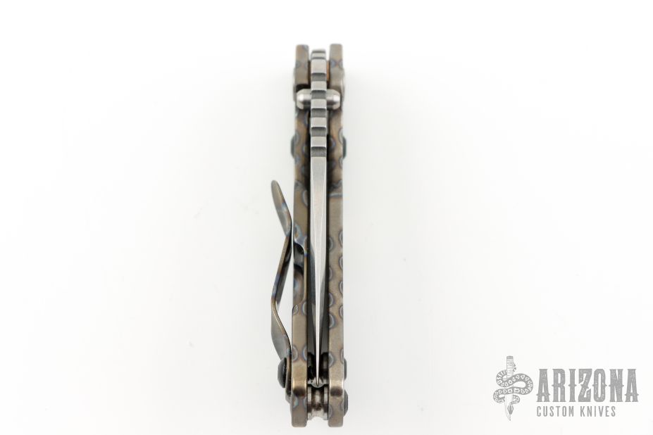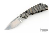 This PT framelock folder features a stonewashed drop point blade with thumbhole and notched thumbrest. The handle has a Disruptive Strider Striped titanium frame with titanium clip, tip up carry. Jimping on blade spine. The frame is from a PT persian. Nice detent, lockup and blade seating. New Condition.