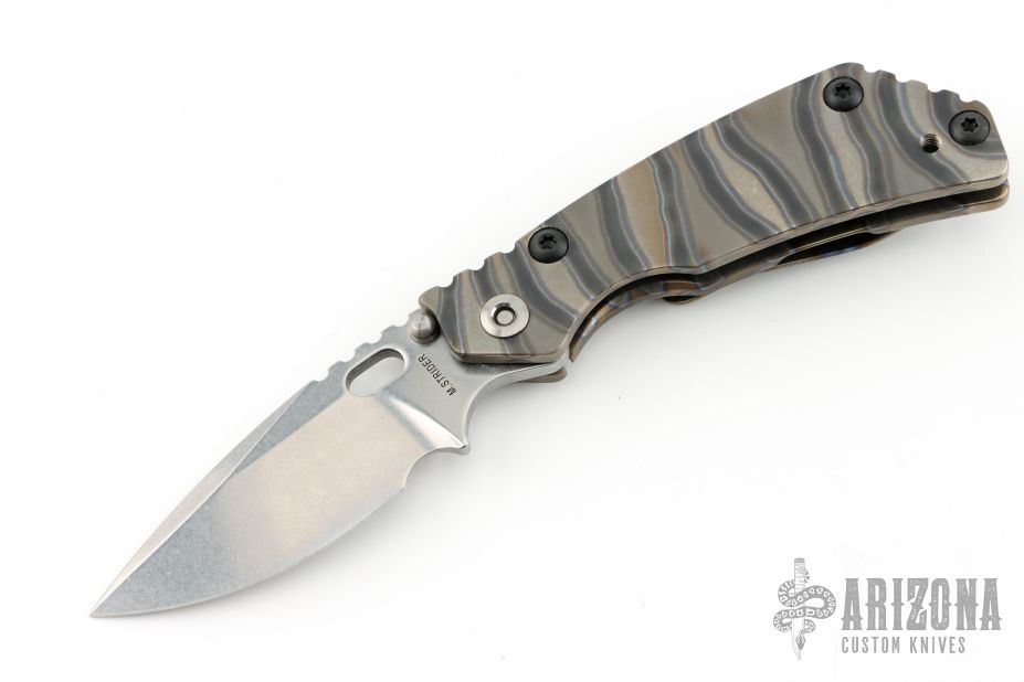 In 1988, he began making specialized knives for use by the military. This turned out to be fortunate turn of events, both for Mick and for the knife using world at large. Mick’s approach was to not get burdened by the weight of past designs. He started with a tabula rasa, a clean slate, informed only by his own experiences and knowledge of what a soldier needed in a knife. The knives he made didn’t look like the hunter-inspired knives seen in most PXs; instead they were almost brutish in their functionality: beefy, solid, and with unbreakable ¼” stock full tangs. These knives were the first indication of his innovative approach: in addition to their utilitarian design, the knives carried a subdued finish and subdued sheaths. No one carrying a Strider knife was going to be spotted because of sunlight glinting off of polished steel or a glossy leather sheath. Soldiers, policemen, and other men going into harm’s way couldn’t buy them fast enough. Mick sampled some good ideas, but made them great. For instance, he was not the first to wrap a knife handle with paracord, but he was the first to do it in a way that was tough enough for sustained infantry use. His knife line grew over the following years to include different varieties of fixed blades, all distinctive and many with specialized uses. But constant in all of them was a disregard for convention, and a desire to try new ideas. An example of this was the Ajax – it featured a very wide blade surface clearly designed to inflict damage. It drew on the weapons carried by Roman legionnaires, yet was modern and usable in the 21stCentury battlefield. Mick also worked on his technical skills, always striving to become better at the physical craft. At the 2002 Blade Show, a group of the best tactical knifemakers in the country decided to compete with each other to produce the most innovative and interesting fixed “battle blade” at the show. Mick’s entry, an incredible integral knife made out of ½” titanium stock with a zippered composite blade, gorgeous handles, and integral guard was the unanimous winner, and effectively retired the competition.