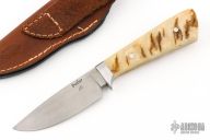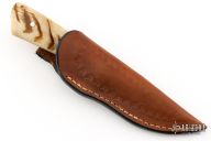 This Hunter by Journeyman Smith Sam Butler features a hand rub satin finished blade with .218" blade stock and 1.151" blade depth, hidden tang construction. The handle has a satin finished stainless steel guard, sheep horn grip. Comes with a hand tooled brown leather sheath and a zippered case. Has a few light scratches, otherwise excellent condition.