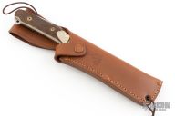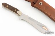 This New White Hunter by Puma is the ultimate outdoorsman’s knife, originally designed by African professional hunters.  .154" Blade Stock.  1.478" Blade Depth. It features a curved blade for cutting, slicing and skinning and a strong back edge for hacking. Handmade by skilled craftsmen with stag scales. Comes with original brown leather sheath and box. Excellent  condition.