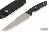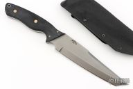 This Predator Tanto by Greg Lightfoot features a bead blasted chisel ground tanto blade with sharpened top edge and a notched thumbrest, .197" blade thickness and 1.472" blade depth, full tang construction. The handle has black canvas micarta scales with lanyard hole. Comes with a kydex sheath. Excellent condition.