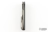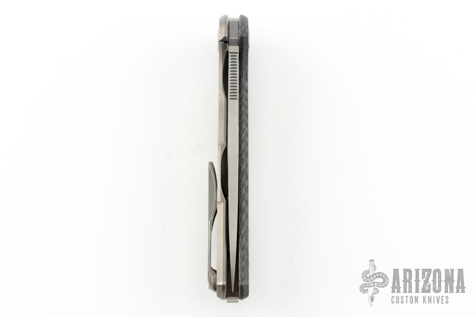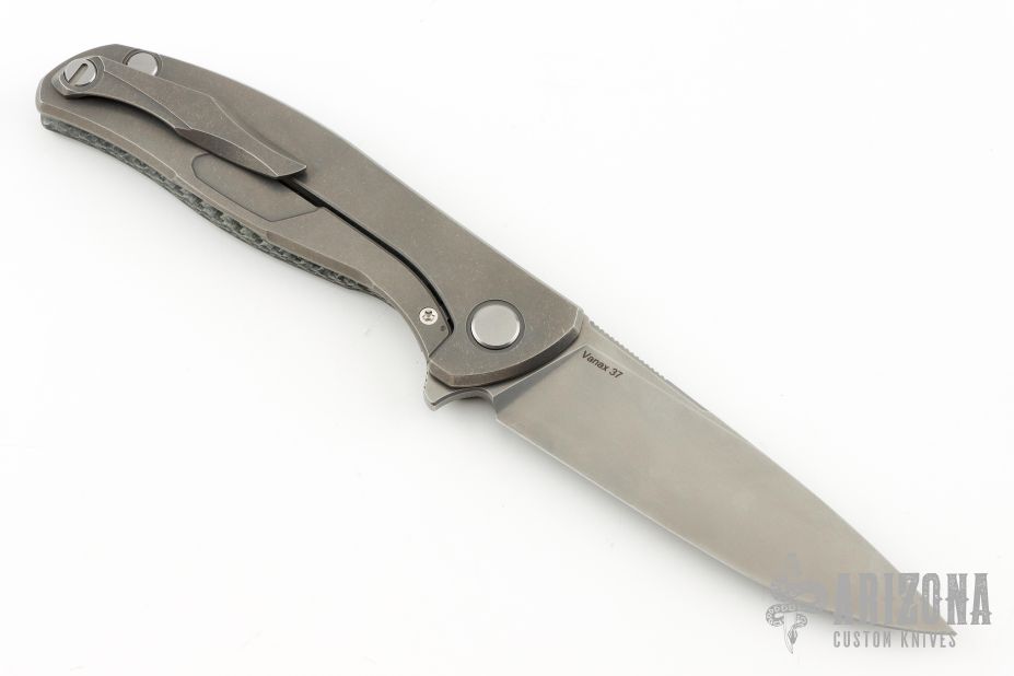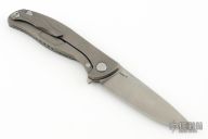 This Hati by Shirogorov Knives features a stonewashed blade with notched thumbrest and flipper. The handle has a silver twill carbon fiber and stonewashed and anodized titanium frame with matching tip up clip and backspacer with lanyard hole. Rides on bearings, nice detent, lockup and blade seating. Comes with original box and papers. Excellent condition.