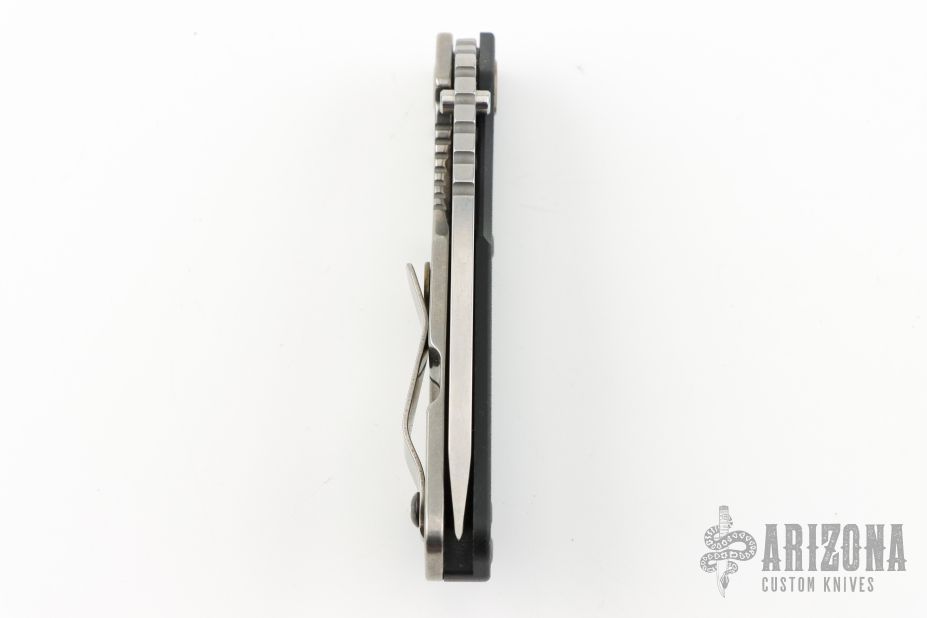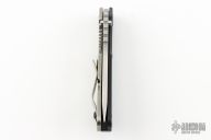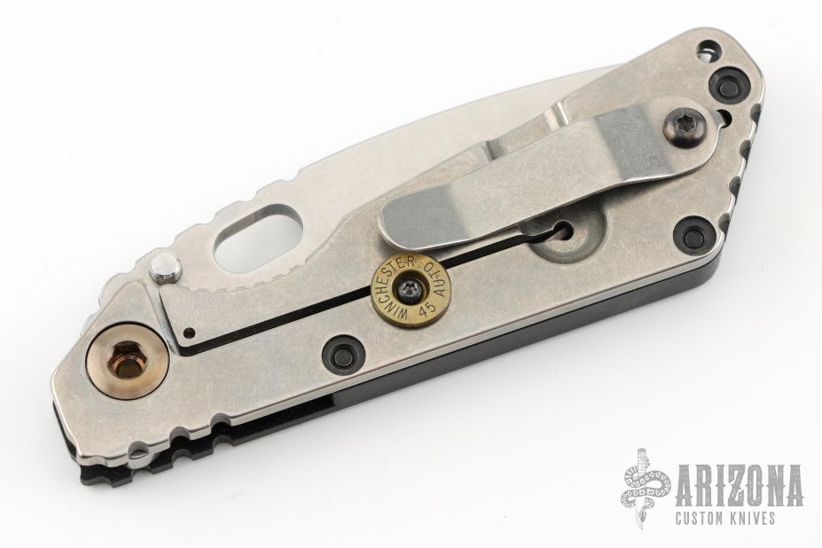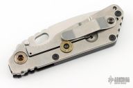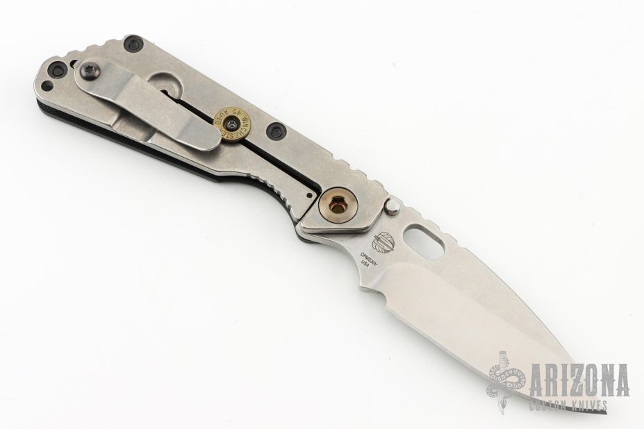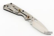 This Mick Strider SNG framelock folder features a stonewashed drop point blade with thumbhole and notched thumbrest. The handle has a black G-10 and flamed titanium frame with titanium clip, tip up carry. Jimping on blade spine. Nice lockup, and blade seating. Excellent Condition.