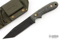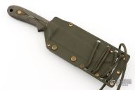 This knife by Newt Livesay features a black chisel ground tanto blade with false top edge, .186" blade stock and 1.145" blade depth, full tang construction. The handle has black linen micarta scales. Comes with a kydex sheath with a belt loop. Has some light scratches and scuffs, otherwise excellent condition.