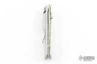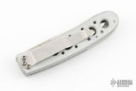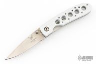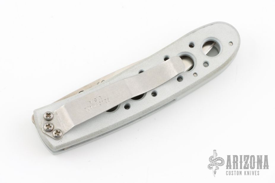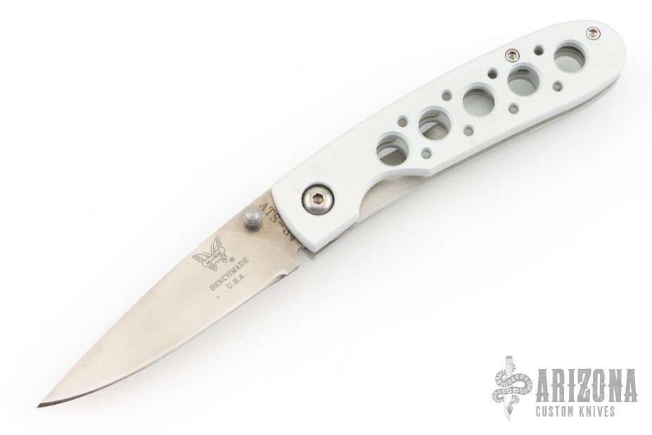 This is a vintage Benchmade designed by Crawford. Bead blast aluminum scales. Tip down carry clip. This knife has some minor discoloration on the handle from handling, as well as some light scuffs and scratches. Great user condition otherwise.