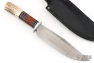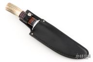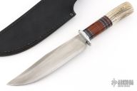 This Scagel Style Hunter by John Greco has a hand rub satin finished blade with false top edge, .199" blade stock and 1.605" blade depth, hidden tang construction. The handle has an aluminum guard, stacked leather and stag grip with black and aluminum spacers. Has some light scratches and oxidation on the blade, otherwise good condition.