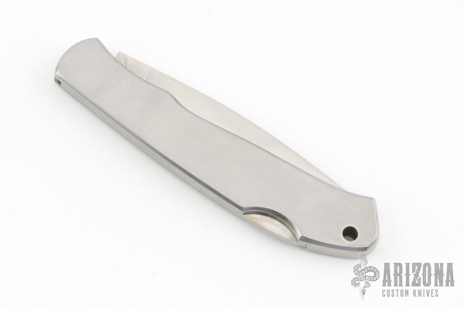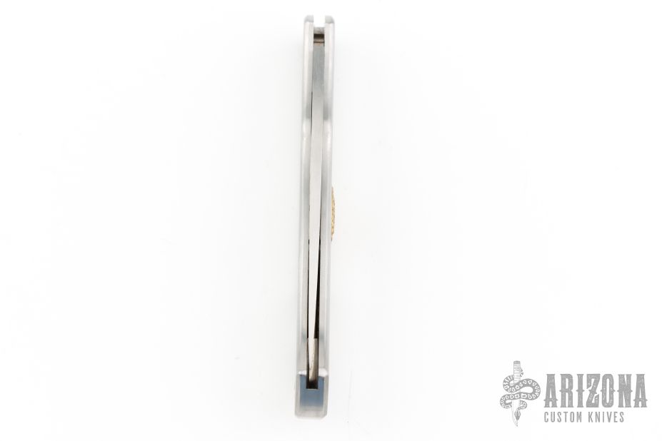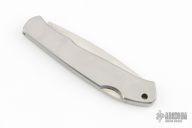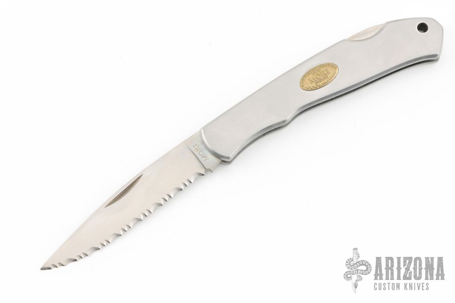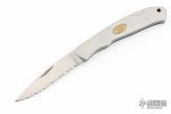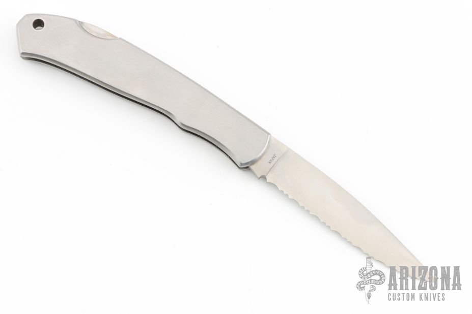 This Lockback by Moki features a mirror polished blade with nail nick and serrations. The handle has a satin finished stainless steel frame with a brass escutcheon. Has some light scuffs and scratches, great condition otherwise.