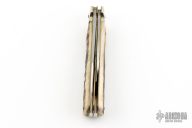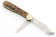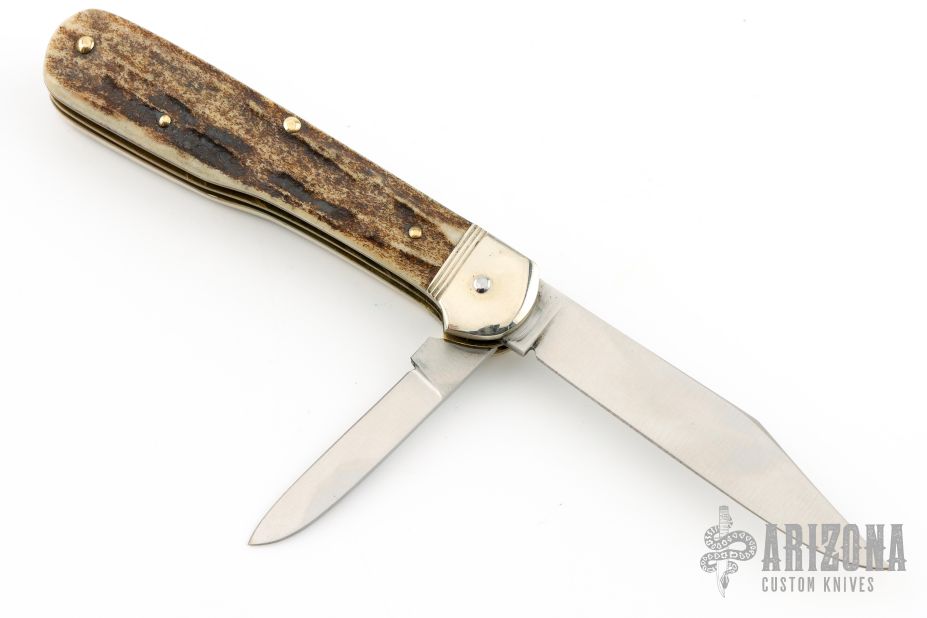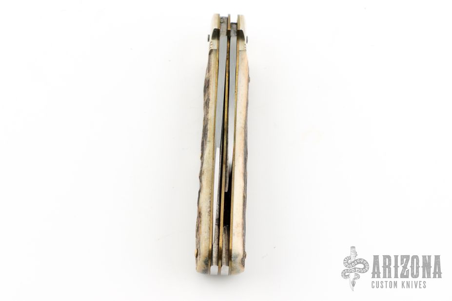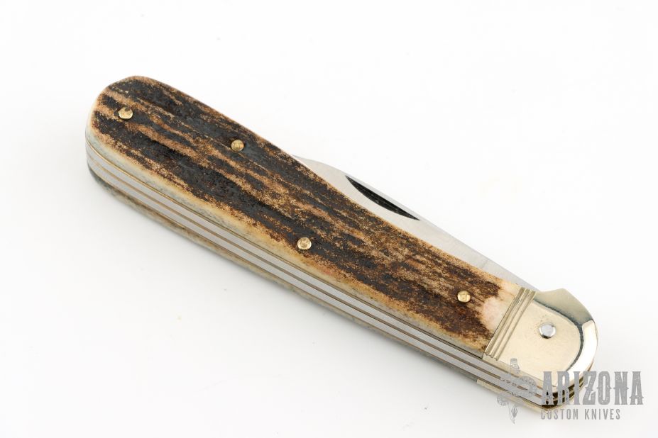 This knife by Hubertus is unique, it features two satin finished blades. The larger blade is an auto and is fired by pressing down on the back of the small blade. The handle has nickel silver bolsters, stag scales, brass liners and steel springs. Has some light scuffs and scratches, great condition otherwise.