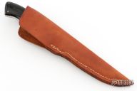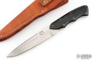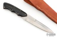 This Fighter by Dick Atkinson has a hand rub satin finished double edged blade with fileworked thumbrest, .197" blade stock, 1.138" depth, full tang construction. The handle has black linen micarta scales with red liners. Comes with a brown leather sheath. Excellent condition.