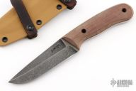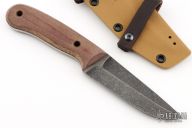 This fixed blade from Dirty Room Knives features a dark tumble finished clip point blade with a full tang construction.  .181" Blade Stock.  1.203" Blade Depth. The handle has brown micarta scales. Lanyard hole in pommel. Includes kydex sheath. Excellent Condition.