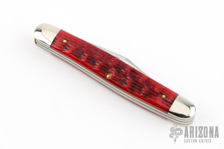 This slipjoint by Schatt and Morgan features two satin finished blades all with nail nicks.  The handle features stainless steel bolsters, brass liners and jigged bone covers. Stainless steel springs. Has a few light scratches, otherwise excellent condition.  Comes with original box. 2009 Show 1 of 150.